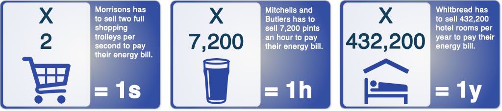 To really highlight the opportunities here, consider that in order to pay their energy bills, Morrisons must sell two full shopping trolleys every second; Mitchells and Butlers must sell 7,200 pints an hour and Whitbread must sell over 400,000 hotel rooms each year. In the last example a 5% bill reduction is equivalent to running a small hotel at full occupancy!