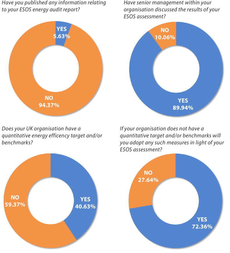 These facts are also supported by the data collected during the ESOS audit and released by the Environmental Agency. While nearly 97% of the completed audits were carried out by external lead assessors and a large majority of audited companies have discussed results at board (74%) and Senior management (90%) level, 60% of companies declared having no energy efficiency targets and only 6% have published information relating to their ESOS audit. Despite this 72% of those companies were open to adopt some form of energy efficiency measures.